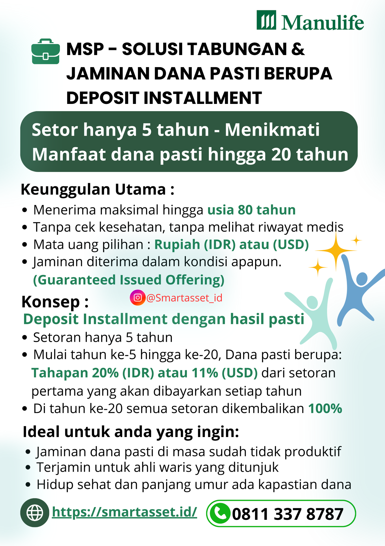 Perkenalkan Kami adalah Perusahaan jasa keuangan yang berdiri sejak tahun 1985 dan merupakan bagian dari grup penyedia layanan keuangan global asal Kanada yang berdiri 23 Juni 1887, Manulife Financial Corporation. Produk kami yang sangat cocok untuk menyiapkan Jaminan Dana Pasti(Dana Pensiun) untuk Anda di hari tua. Menerima kondisi apapun tanpa melihat riwayat kesehatan Anda. (Guaranteed Issued Offering). Info ilustrasi produk bisa dilihat pada gambar dibawah ini.